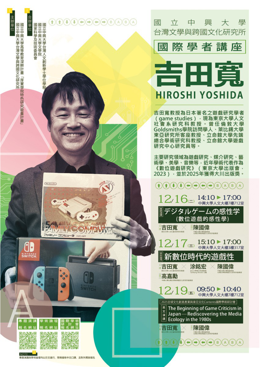 吉田寬教授為日本著名之遊戲研究(game studies)學者,現為東京大學人文社會系研究科教授。曾任倫敦大學Goldsmiths學院訪問學人、萊比錫大學東亞研究所客座教授、立命館大學先端總合學術研究科教授、立命館大學遊戲研究中心研究員等。主要研究領域為遊戲研究、媒介研究、藝術學、美學、音樂等,近年學術代表作為《數位遊戲研究》(東京大學出版會,2023),並於2025年獲得大川出版獎。本次安排三場講座,歡迎有興趣的學者專家與研究生報名。